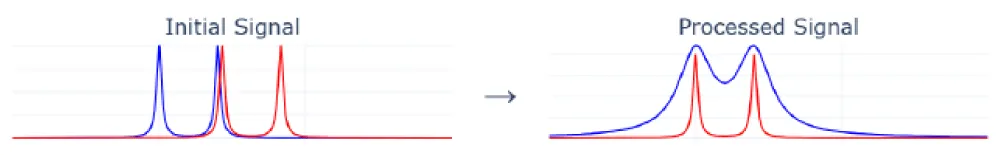 The optimization problem arises due to narrow peaks, when incorrectly selected initial parameters can lead to a significant mismatch between experimental and generated peaks. For example, if the right peak of one doublet merges with the left peak of another, as shown in Figure 1, the optimization algorithm may fall into the trap of a local minimum. To solve this problem, we broadened the peaks of the experimental spectrum using convolution with a Lorentzian kernel.