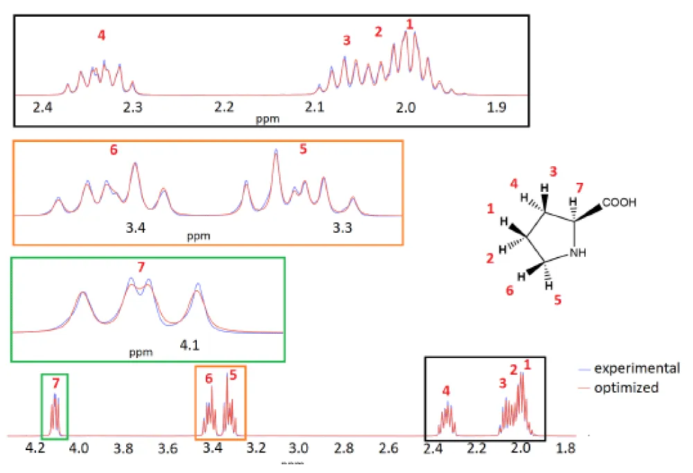 The obtained data allow us to conclude that our method gives results better than known open-source solutions, while not requiring manual processing. IoU metrics calculated for spin system parameters optimized for five different NMR spectra of L-Proline demonstrate better results than for spin systems with fixed J obtained from [30] and ChenomX. In addition, we demonstrate better optimization of spin system parameters for the spectra of the most common amino acids available in the GISSMO [18] database. The obtained model and parameters of the spin systems of metabolite molecules can be used to automate the determination of metabolite concentrations in biological samples and significantly accelerate and simplify the analysis of samples in the field of NMR metabolomics.