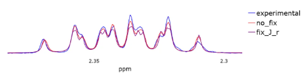 For clarity, we will also attach the graphs we have obtained. The graphs in Figure 4 illustrate the experimental spectrum, the spectrum calculated based on the spin system using ChenomX (designated “fix J r”), and the spectrum obtained from a fully optimized Table 3: Comparison of IoU for different spectra of proline model that includes interaction constants and correction factors (designated “no fix”). In Figure 5, it can be seen that the use of relaxation rates significantly improves the accuracy of the spectrum reconstruction. Figure 4 demonstrates how the model effectively handles complex peak features.