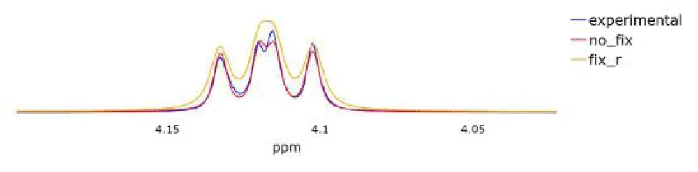 We will use the spin matrix provided by the ChenomX library for proline to find out if the parameters of our spin system can be improved. To do this, we will keep a fixed spin-spin coupling matrix J and try to optimize the remaining parameters by changing only the values of chemical shift δ and peak width w. Similarly, let’s look at optimization with additional fixed parameters of the effective peak intensity coefficient r and a system in which we optimize all parameters. We will evaluate the quality using the indicator we entered.